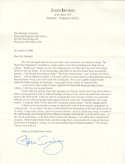 The head librarian wrote a letter to John Irving, and he wrote them back, and sent signed copies of 5 of his books. How awesome is that?
